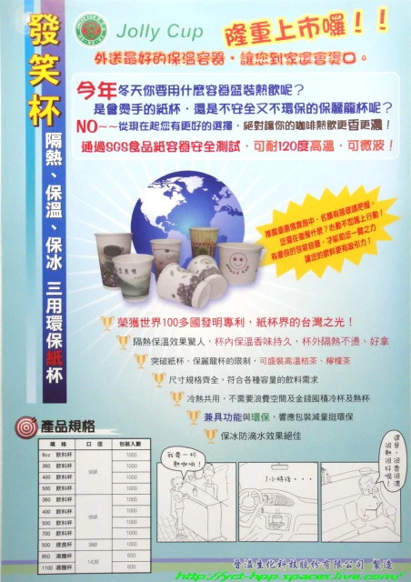台灣製造冰、熱兩用【發笑杯】,顛覆傳統 ,將紙杯及紙杯套結合製成,有較佳隔熱 、保熱 、保冰、可直接微波等多項功能 。